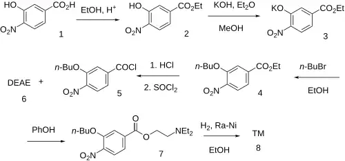 The nitration of 3-hydroxybenzoic acid [99-06-9] (0) gives 3-hydroxy-4-nitrobenzoic acid [619-14-7] (1). Fischer esterification with ethanol gives ethyl 3-hydroxy-4-nitrobenzoate [717-01-1] (2). The phenoxide ion was then prepared from potash (3). Alkylation with 1-bromobutane supplied ethyl 3-butoxy-4-nitrobenzoate, CID:13346201 (4). The product is crystallized from hydrochloric acid, and then halogenation with thionyl chloride gives 3-butoxy-4-nitrobenzoyl chloride [23442-21-9] (5). Esterification with diethylaminoethanol [100-37-8] (6) gives 2-(diethylamino)ethyl 3-butoxy-4-nitrobenzoate, CID:13346204 (7) Lastly, catalytic hydrogenation over Raney-Nickel completes the synthesis of Oxybuprocaine (8).