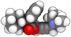 Oxybutynin contains one stereocenter. Commercial formulations are sold as the racemate. The (R)-enantiomer is a more potent anticholinergic than either the racemate or the (S)-enantiomer, which is essentially without anticholinergic activity at doses used in clinical practice.[22][23] However, (R)-oxybutynin administered alone offers little or no clinical benefit above and beyond the racemic mixture. The other actions (calcium antagonism, local anesthesia) of oxybutynin are not stereospecific. (S)-Oxybutynin has not been clinically tested for its spasmolytic effects, but may be clinically useful for the same indications as the racemate, without the unpleasant anticholinergic side effects.