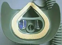 Silicone and rubber oxygen masks are heavier than plastic masks. They are designed to provide a good seal for long-duration use by aviators, medical research subjects, and hyperbaric chamber and other patients who require administration of pure oxygen, such as carbon monoxide poisoning and decompression sickness victims. Dr. Arthur H. Bulbulian pioneered the first modern viable oxygen mask, worn by World War II pilots and used by hospitals.[2] Valves inside these tight-fitting masks control the flow of gases into and out of the masks, so that rebreathing of exhaled gas is minimised.