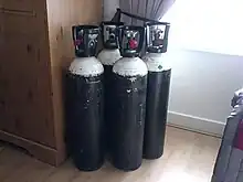 Gas cylinders containing oxygen to be used at home. When in use a pipe is attached to the cylinder's regulator and then to a mask that fits over the person's nose and mouth.