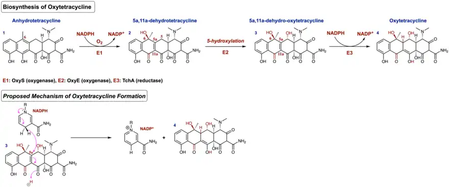 After the formation of anhydrotetracycline, ATC monooxygenase (OxyS) oxidizes the C-6 position in an enantioselective manner in the presence of the cofactor NADPH and atmospheric oxygen to produce 5a,11a-dehydrotetracycline.[16] Next, a hydroxylation occurs at the C-5 position of 5a,11a-dehydrotetracycline via the oxygenase encoded as OxyE in the oxytetracycline gene cluster. This produces the intermediate 5a,11a-dehydro-oxytetracycline. However, the exact mechanism of this step remains to be unclear. The final step of this biosynthesis occurs through the reduction of a double bond in the α, β—unsaturated ketone of 5a,11a-dehydro-oxytetracycline. In this final step, the cofactor NADPH is employed by TchA (reductase) as the reducing agent. Upon reduction, the enol form is favored due to conjugation, thus producing the aromatic polyketide oxytetracycline. Figure 2 shows the biosynthesis as described above, as well as an arrow-pushing mechanism of NADPH being used as the final cofactor in the biosynthesis of oxytetracycline.