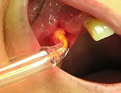 In 1892 The Lancet published an article describing the administration of ozone for treatment of tuberculosis.[40] During World War I, ozone was tested at Queen Alexandra Military Hospital in London as a possible disinfectant for wounds. The gas was applied directly to wounds for as long as 15 minutes. This resulted in damage to both bacterial cells and human tissue. Other sanitizing techniques, such as irrigation with antiseptics, were preferable.[41][42]