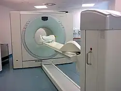 Positron emission tomography–computed tomography (better known as PET–CT or PET/CT) is a nuclear medicine technique which combines, in a single gantry, a positron emission tomography (PET) scanner and an x-ray computed tomography (CT) scanner, to acquire sequential images from both devices in the same session, which are combined into a single superposed (co-registered) image. Thus, functional imaging obtained by PET, which depicts the spatial distribution of metabolic or biochemical activity in the body can be more precisely aligned or correlated with anatomic imaging obtained by CT scanning. Two- and three-dimensional image reconstruction may be rendered as a function of a common software and control system.[1]