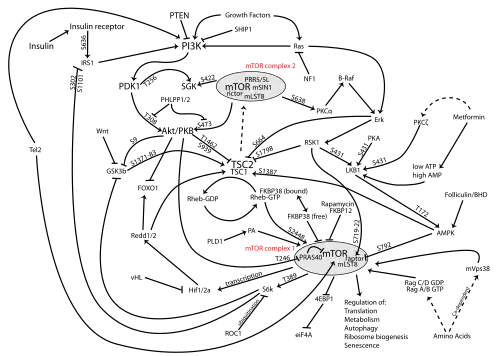 The PI3K/AKT/mTOR pathway is an intracellular signaling pathway important in regulating the cell cycle. Therefore, it is directly related to cellular quiescence, proliferation, cancer, and longevity. PI3K activation phosphorylates and activates AKT, localizing it in the plasma membrane.[1] AKT can have a number of downstream effects such as activating CREB,[2] inhibiting p27,[3] localizing FOXO in the cytoplasm,[3] activating PtdIns-3ps,[4] and activating mTOR[3] which can affect transcription of p70 or 4EBP1.[3] There are many known factors that enhance the PI3K/AKT pathway including EGF,[5] shh,[2] IGF-1,[2] insulin,[3] and calmodulin.[4] Both leptin and insulin recruit PI3K signalling for metabolic regulation.[6] The pathway is antagonized by various factors including PTEN,[7] GSK3B,[2] and HB9.[5]
