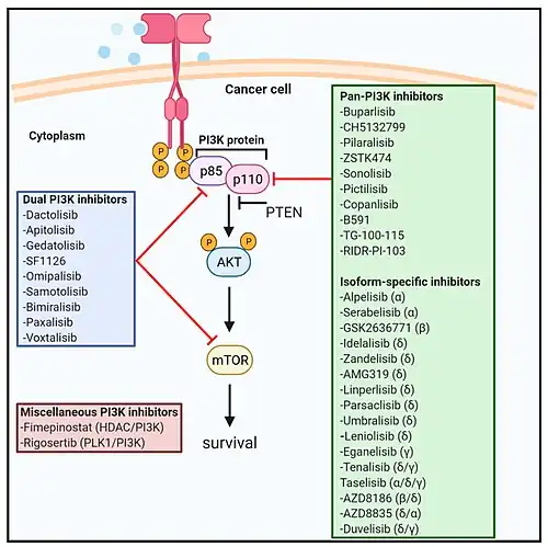 - ↑ Mishra R, Patel H, Alanazi S, Kilroy MK, Garrett JT (March 2021). "PI3K Inhibitors in Cancer: Clinical Implications and Adverse Effects". International Journal of Molecular Sciences. 22 (7): 3464. doi:10.3390/ijms22073464. PMC 8037248. PMID 33801659.