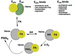 It has been found that human PTGS2 (COX-2) functions as a conformational heterodimer having a catalytic monomer (E-cat) and an allosteric monomer (E-allo). Heme binds only to the peroxidase site of E-cat while substrates, as well as certain inhibitors (e.g. celecoxib), bind the COX site of E-cat. E-cat is regulated by E-allo in a way dependent on what ligand is bound to E-allo. Substrate and non-substrate fatty acids (FAs) and some PTGS (COX) inhibitors (e.g. naproxen) preferentially bind to the PTGS (COX) site of E-allo. Arachidonic acid can bind to E-cat and E-allo, but the affinity of AA for E-allo is 25 times that for Ecat. Palmitic acid, an efficacious stimulator of huPGHS-2, binds only E-allo in palmitic acid/murine PGHS-2 co-crystals. Non-substrate FAs can potentiate or attenuate PTGS (COX) inhibitors depending on the fatty acid and whether the inhibitor binds E-cat or E-allo. Studies suggest that the concentration and composition of the free fatty acid pool in the environment in which PGHS-2 functions in cells, also referred to as the FA tone, is a key factor regulating the activity of PGHS-2 and its response to PTGS (COX) inhibitors.[22]