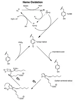 - ↑ Wu G, Wei C, Kulmacz RJ, Osawa Y, Tsai AL (April 1999). "A mechanistic study of self-inactivation of the peroxidase activity in prostaglandin H synthase-1". The Journal of Biological Chemistry. 274 (14): 9231–9237. doi:10.1074/jbc.274.14.9231. PMID 10092596.