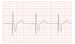 | Ventricular pacemaker with 1:1 retrograde ventriculoatrial (V-A) conduction to the atria (arrows). | |