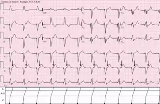 Pacemaker syndrome is a condition that represents the clinical consequences of suboptimal atrioventricular (AV) synchrony or AV dyssynchrony, regardless of the pacing mode, after pacemaker implantation.[1][2] It is an iatrogenic disease—an adverse effect resulting from medical treatment—that is often underdiagnosed.[1][3] In general, the symptoms of the syndrome are a combination of decreased cardiac output, loss of atrial contribution to ventricular filling, loss of total peripheral resistance response, and nonphysiologic pressure waves.[2][4][5]