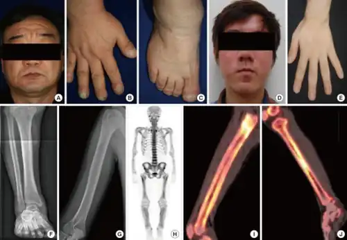 3. 3.0 3.1 3.2 3.3 3.4 3.5 Martínez-Ferrer A, et al. (2009). "Prostaglandin E2 and bone turnover markers in the evaluation of primary hypertrophic osteoarthropathy (pachydermoperiostosis): a case report". Rheumatol. Clin. 28 (10): 1229–1233. doi:10.1007/s10067-009-1197-9. PMID 19455364. S2CID 24964091.