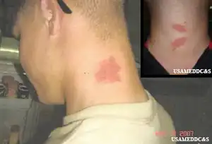 Once pederin is on the skin from the initial beetle contact, it may also be spread elsewhere on the skin. "Kissing" or "mirror-image" lesions where two skin areas come in contact (for example, the elbow flexure) are often seen.[6] Washing the hands and skin with soap and water is strongly recommended, if contact with a rove beetle has occurred.[8]