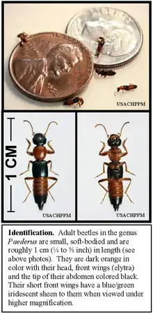 - ↑ 8.0 8.1 "Just the facts…Paederus Beetles" (PDF). US Army Public Health Command. Archived from the original (PDF) on 29 August 2012. Retrieved 30 July 2011. Archived 16 March 2012 at the Wayback Machine