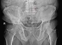 The exact cause is unknown, but around 15% of people with Paget's disease have a relative with the disease, suggesting some genetic factors.[1] It never affects the entire skeleton,[2][3] and does not spread from bone to bone.[4] It involves cellular remodeling and deformity of one or more bones. The affected bones show signs of dysregulated bone remodeling at the microscopic level, specifically excessive bone breakdown and subsequent disorganized new bone formation.[2] Less than 1% can transform into a malignant bone cancer.[1]