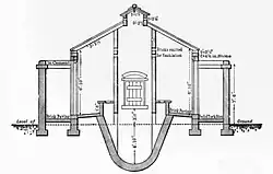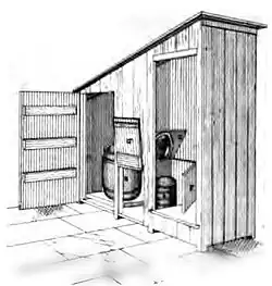 Earth closets were usually housed in a separate building from the main structure and were well ventilated. As with the pail system, earth closet containers were designed to be emptied frequently.[19] The earth closet was popular and was used in private houses, military camps, hospitals and extensively in India. It remained in use well into the 1930s.[20]