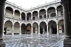 After the end of the Inquisition, in 1838, it was put up for sale by public auction, but no one offered the minimum price. It was finally purchased by the archbishopric.[2] Later it served as lottery offices, a primary school and a military barracks.[3] In 1854, it was sold to the School of Medicine, which at the time was offering classes in professors' homes. After the purchase, a number of changes were made, and a boarding school created here.[2] Eventually, it would become the school of medicine and nursing of the National University (today's UNAM)[3] In 1873, in despair over an unrequited love, romantic poet Manuel Acuña committed suicide by poison in a room here.[2] In 1879, after modification, the old chapel became the Academy of Medicine and a third floor was added, which resulted in the removal of the crest which held the coat-of-arms of the Inquisition.[2]