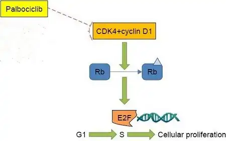 {{cite journal}}: CS1 maint: unflagged free DOI (link) - ↑ Rocca A, Farolfi A, Bravaccini S, Schirone A, Amadori D (2014). "Palbociclib (PD 0332991): targeting the cell cycle machinery in breast cancer". Expert Opin Pharmacother. 15 (3): 407–20. doi:10.1517/14656566.2014.870555. PMID 24369047. S2CID 23229580.