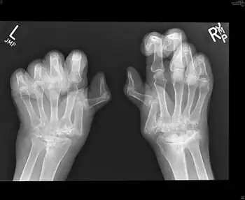 Palindromic rheumatism (PR) is a syndrome characterised by recurrent, self-resolving inflammatory attacks in and around the joints, consists of arthritis or periarticular soft tissue inflammation.[1] The course is often acute onset, with sudden and rapidly developing attacks or flares. There is pain, redness, swelling, and disability of one or multiple joints. The interval between recurrent palindromic attacks and the length of an attack is extremely variable from few hours to days. Attacks may become more frequent with time but there is no joint damage after attacks. It is thought to be an autoimmune disease, possibly an abortive form of rheumatoid arthritis.