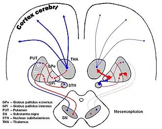 ![]() The image shows dopaminergic pathways of the human brain in normal condition (left) and Parkinsons Disease (right). Red Arrows indicate suppression of the target, blue arrows indicate stimulation of target structure. (Pallidothalamic connections visible but not labeled, as red line from GPi to THA.) | |