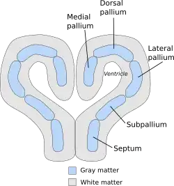 The general layout or body plan of the pallium is already clearly defined in animals with relatively simple brains, including lampreys, sharks and amphibians. In teleost fish, reptiles, birds, and mammals, the pallial architecture is greatly modified (sharply diverging in fish), with differential growth and specialization of diverse sectors of the conserved pallial Bauplan. In all vertebrate brains, the telencephalic forebrain consists of two hemispheres, joined at the midline by a region called the septum. The septum is continuous with the preoptic area across the plane defined by the anterior commissure; it is largely subpallial, but also contains a small pallial portion, where the hippocampal commissure forms, which is contiguous to the medial pallium. The telencephalic part of the rostral choroidal tela (roof plate continuous caudally with a diencephalic part) is inserted at the back of this commissure at a locus where mammals show the subfornical circumventricular organ, and extends laterally over the interventricular foramen into a wing-shaped medial telencephalic territory, the so-called choroidal fissure. Here the choroidal tissue is attached to the fimbria of the hippocampus, bordering lengthwise the medial pallium. At its rostral and caudal ends, the medial pallium contacts the ventral pallium, which builds the pallial portion that contacts the subpallium across the pallio subpallial boundary, observed at the lateral telencephalic wall. Inside the ring formed thus by the medial and ventral pallium there is a sort of island that contains the dorsal and lateral pallial portions. In older literature the pallium used to be subdivided only into three zones, called the medial pallium, dorsal (or dorsolateral) pallium, and lateral pallium. The old lateral pallium encompassed the modern lateral and ventral parts of the pallium. The medial pallium is the progenitor of the mammalian hippocampus, and is thought to be involved in spatial cognitive mapping and memory formation across a broad range of species. The lateral and ventral pallium is the progenitor of the mammalian piriform cortex, and has an olfactory function in every species in which it has been studied. The evolutionary diversifications and specialization in functions of the dorsal pallium have been more difficult to decipher. It is widely believed to be the progenitor of the bulk of the mammalian cerebral cortex, although the evidence for this is considered by some anatomists not yet to be conclusive.[2] In mammals and birds, the dorsal pallium increased in size and became the predominant brain region for sensory processing and the end site of sensory consciousness, the hypothesized reason for which is because of the nocturnal and burrowing lifestyle of ancestral mammals and the arboreal and volant lifestyle of ancestral birds.[3]