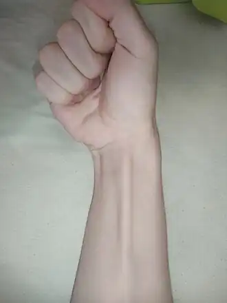 ![]() Palmaris longus tendon shown during wrist flexion with a clenched fist | |