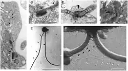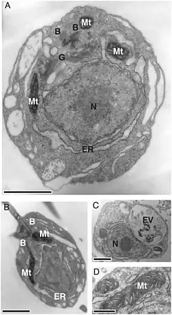 Ultrastructural analysis shows a single mitochondrion with lobed extensions and an endoplasmic reticulum surrounding the nucleus. A Golgi apparatus is located between the nucleus and flagella, and two microtubular roots support the basal bodies. The anterior flagellum of Palpitomonas possesses mastigonemes—bipartite hair-like structures that aid in movement and feeding by creating a current that draws in food particles. Electron microscopy has shown that Palpitomonas doesn't has ejectosomes an organelle used for rapid ejection of cell contents, which is present in cryptophytes but absent in katablepharids and Palpitomonas. This lack of ejectosomes and other features further distinguishes Palpitomonas from other cryptists.[1][4]
