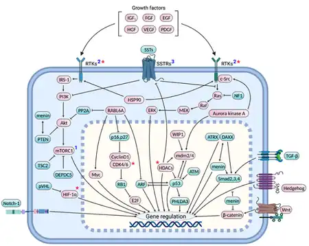 - ↑ Maharjan, Chandra K.; Ear, Po Hien; Tran, Catherine G.; Howe, James R.; Chandrasekharan, Chandrikha; Quelle, Dawn E. (12 October 2021). "Pancreatic Neuroendocrine Tumors: Molecular Mechanisms and Therapeutic Targets". Cancers. 13 (20): 5117. doi:10.3390/cancers13205117. ISSN 2072-6694. Retrieved 21 February 2025.