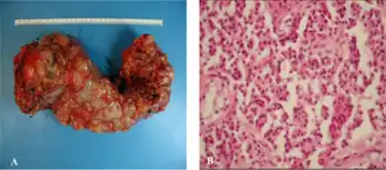 | A) Gross specimen shows generalized enlargement of pancreas with extensive nodularity and calcifications representing diffuse tumor involvement. B) Photomicrograph shows uniformity and cellular features typical of neuroendocrine tumor (H and E, 100x) | |