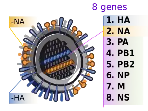Gene sequences for every viral gene were made available through the Global Initiative on Sharing Avian Influenza Data (GISAID).[96][97] A preliminary analysis found that the hemagglutinin (HA) gene was similar to that of swine flu viruses present in U.S. pigs since 1999, but the neuraminidase (NA) and matrix protein (M) genes resembled versions present in European swine flu isolates. While viruses with this genetic makeup had not previously been found to be circulating in humans or pigs, there is no formal national surveillance system to determine what viruses are circulating in pigs in the U.S.[98] So far, little is known about the spread of the virus in any pig population. A preliminary analysis has also shown that several of the proteins involved in the pathophysiology of the virus are most similar to strains that cause mild symptoms in humans. This suggests the virus is unlikely to cause severe infections similar to those caused by the 1918 pandemic flu virus or the H5N1 avian influenza.[99]