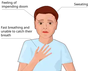 Panic disorder is an anxiety disorder characterized by reoccurring unexpected panic attacks.[1] Panic attacks are sudden periods of intense fear that may include palpitations, sweating, shaking, shortness of breath, numbness, or a feeling that something terrible is going to happen.[1][2] The maximum degree of symptoms occurs within minutes.[2] There may be ongoing worries about having further attacks and avoidance of places where attacks have occurred in the past.[1]