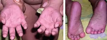 | Typical lesions of papular purpuric gloves and socks syndrome in child. | |