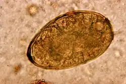 - Eggs: Paragonimus westermani eggs range from 80 to 120 µm long by 45 to 70 µm wide. They are yellow-brown, ovoid or elongate, with a thick shell, and often asymmetrical with one end slightly flattened. At the large end, the operculum is clearly visible. The opposite (abopercular) end is thickened. The eggs are unembryonated when passed in sputum or feces.[4]