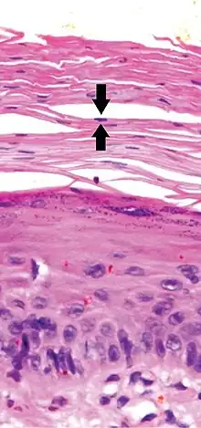 Parakeratosis is a mode of keratinization characterized by the retention of nuclei in the stratum corneum.[1] In mucous membranes, parakeratosis is normal.[2] In the skin, this process leads to the abnormal replacement of annular squames with nucleated cells. Parakeratosis is associated with the thinning or loss of the granular layer and is usually seen in diseases of increased cell turnover, whether inflammatory or neoplastic. Parakeratosis is seen in the plaques of psoriasis and in dandruff.