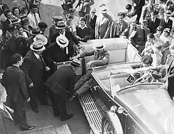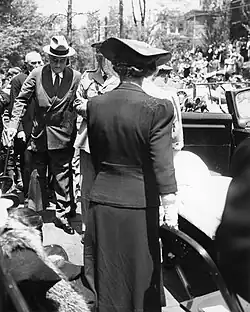 Roosevelt took great care to convince even close confidants that he was getting better, which he believed was essential if he was to run for public office again. To Richard E. Byrd, he wrote "By next autumn I will be ready to chase the nimble moose with you." To General Leonard Wood: his leg muscles "were all coming back".[12] His public appearances were carefully choreographed to avoid the press covering his arrival and departure, which would have shown him getting into or out of a vehicle or train. In private he used a wheelchair, but was careful not to be seen using it in public, although he sometimes appeared on crutches. He usually appeared in public standing upright, supported on one side by an aide or one of his sons. For major speaking occasions, an especially solid lectern was placed on the stage so that he could support himself on it; as a result, in films of his speeches, Roosevelt can be observed using his head to make gestures because his hands were gripping the lectern.[4]: 88–105