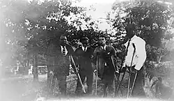 Roosevelt was totally and permanently paralyzed from the waist down, and unable to stand or walk without support.[8] For the next few months, he confined himself to indoor pursuits, including resuming his lifelong hobby of stamp collecting.[9] In December 1921, after he had recuperated for several months, a physiotherapist began working with him to determine the extent of the damage. He was able to perform small exercises on his own, moving one muscle and then another.[10] He was fitted with heavy steel braces that locked at the knee and provided enough stability that he could stand with crutches. In 1922, at Springwood, he worked diligently to make his way across the room. He set himself the goal of getting down the long driveway, which he did once but never attempted again.[5]: 241