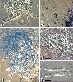 There are currently 17 validly described species of Paramoebidium.[2] Several other species were described but are considered invalid due to a lack of descriptive detail and/or illustrations.[2][8] Species have been described based on the morphological features of the thalli, cysts, and cystospores. Host type is also reported for species, but it is unclear how host specific different Paramoebidum species may be.[2] Thallus shapes range from straight, short, and fat to long and sigmoidal, to branched or coiled. For example, P. curvum[9] have short, coiled, thick thalli and are found in black fly larvae (Simuliidae), whereas P. hamatum[10] have relatively long thalli that are consistently curved near the base giving them a "candy cane" appearance and are associated mainly with mayfly nymphs (Ameletidae and Baetidae) but also midge larvae. However, while Paramoebidium species are relatively common among trichomycete collections,[11][2] description of new species is problematic due to the amount of intra- and interspecific variability of the morphological characters.[12] Furthermore, no species have been obtained in axenic culture, so observations are limited to the individuals present at the time of host dissections and some stages of the life cycle (e.g. dispersal amoebae) may not be present in the collection.