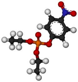 Paraoxon is a parasympathomimetic drug which acts as an cholinesterase inhibitor. It is an organophosphate oxon, and the active metabolite of the insecticide parathion. It is also used as an ophthalmological drug against glaucoma. Paraoxon is one of the most potent acetylcholinesterase-inhibiting insecticides available, around 70% as potent as the nerve agent sarin, and so is now rarely used as an insecticide due to the risk of poisoning to humans and other animals. Paraoxon has been used by scientists to study acute and chronic effects of organophosphate intoxication.[1][2] It is easily absorbed through skin, and was allegedly used as an assassination weapon by the apartheid-era South African chemical weapons program Project Coast.[3]