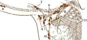 ![]() 2. Axillary lymphatic plexus 4. Cubital lymph nodes (not part of the lymph node drainage of the breast) 5. Superficial axillary (low axillary) 6. Deep axillary lymph nodes 7. Brachial axillary lymph nodes 8. Interpectoral axillary lymph nodes (Rotter nodes) 10. Paramammary or intramammary lymph nodes 11. Parasternal lymph nodes (internal mammary nodes) | |