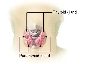 ![]() Thyroid and parathyroids as viewed from the front of the neck | |
