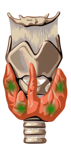 ![]() Diagram showing structures in the human neck. The four green shaded areas represent the most common position of the parathyroid glands, which are generally four in number and situated behind the lateral lobes of the thyroid gland (shaded orange). | |