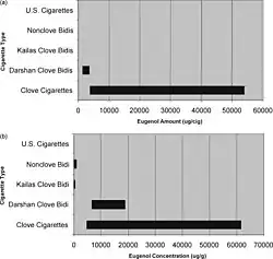 - ↑ Stanfill, S. B; Calafat, A. M; Brown, C. R; Polzin, G. M; Chiang, J. M; Watson, C. H; Ashley, D. L (2003-02-01). "Concentrations of nine alkenylbenzenes, coumarin, piperonal and pulegone in Indian bidi cigarette tobacco". Food and Chemical Toxicology. 41 (2): 303–317. doi:10.1016/S0278-6915(02)00230-2. ISSN 0278-6915. PMID 12480305.