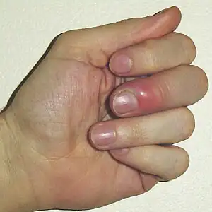 Paronychia is inflammation of the skin around the nail.[5] It may present suddenly with pain, redness, swelling, and pus; or gradually with mild tenderness, redness, and nail changes.[2][3] The index and middle fingers are most commonly affected, though other fingers or toes may be involved.[2][1] Complications may include an abscess.[3]