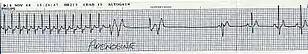 | Lead II electrocardiogram strip showing PSVT with a heart rate of about 180. | |