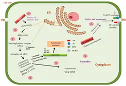 Viral replication is cytoplasmic. Entry into the host cell is achieved by penetration. Replication follows the positive-stranded RNA virus replication model. Positive-stranded RNA virus transcription is the method of transcription. Translation takes place by −1 ribosomal frameshifting. The virus exits the host cell by tubule-guided viral movement.[4][5] Plants serve as the natural host. The virus is transmitted via a vector (often an insect or mite). Transmission routes are vector and mechanical.[4][5]