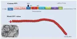 Genome of plum pox virus of genus Potyvirus with transmission electron micrograph and model of virions