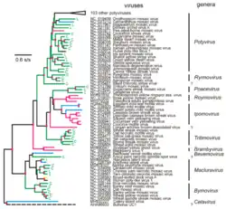 Potyviridae is a family of positive-strand RNA viruses that encompasses more than 30% of known plant viruses,[1][2] many of which are of great agricultural significance. The family contains 13 genera that contain 259 species.[3][4][5][6]