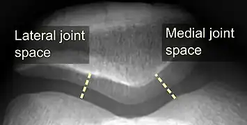 - The patellofemoral index is the ratio between the thickness of the medial joint space and the lateral joint space (L). With the knee 20° flexed, it should measure 1.6 or less.[16]