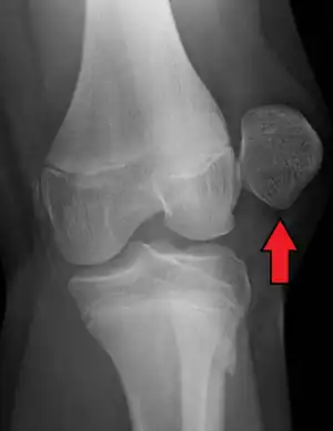 A patellar dislocation is a knee injury in which the patella (kneecap) slips out of its normal position.[5] Often the knee is partly bent, painful and swollen.[1][2] The patella is also often felt and seen out of place.[1] Complications may include a patella fracture or arthritis.[3]