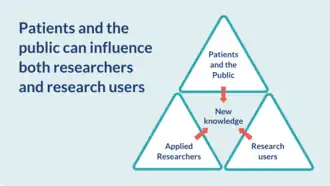 The National Institute for Health and Care Research (NIHR) uses the term public partnerships to encompass the components of involvement, engagement and participation. It can be summarised as "a term to collectively describe ways in which patients, service users, carers and members of the public work with researchers, and health and care professionals, in the creation and use of health and care research".[7] The NIHR's terminology differentiates involvement from participation where people take part in a research study and engagement which is sharing information and knowledge about research with the public.[5]