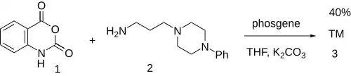 Pelanserin (3) can be synthesized by a reaction between isatoic anhydride (1) and 1-(3-aminopropyl)-4-phenylpiperazine (2) in the presence of phosgene.[2][3][4][5][6][7][8][9]