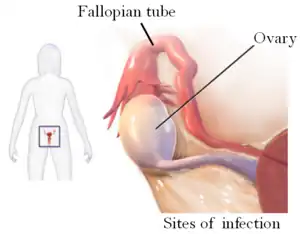 PID in females may lead to a tubo-ovarian abscess, where the abscess may be in the fallopian tube or ovary.[1][2]